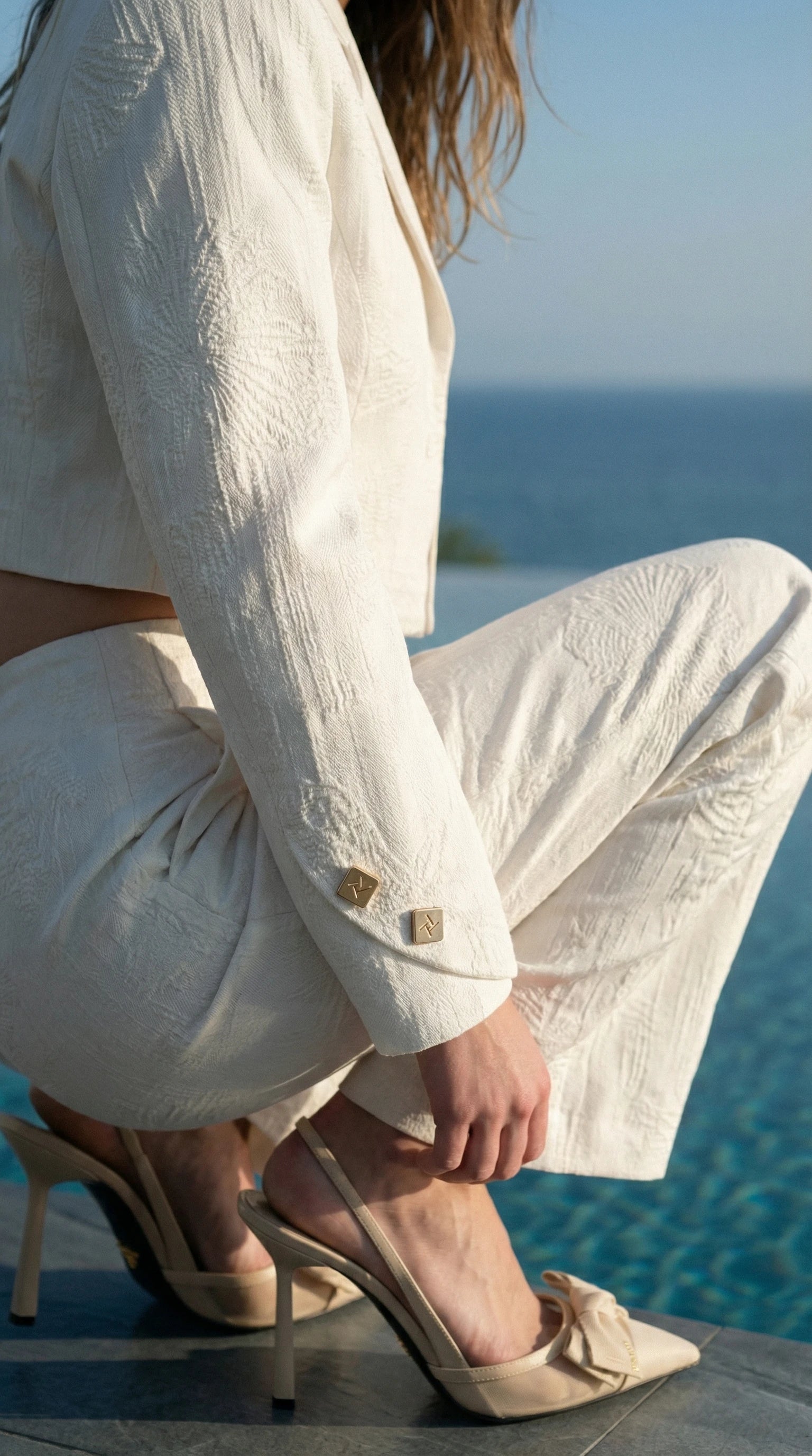 The Positano Jacket completes the Amalfi trousers in a sharply defined silhouette. Crafted from textured sand cotton bull denim with a subtle tone-on-tone floral motif, it balances structure with understated texture. The cut emphasizes a strong shoulder and defined waist. Slightly cropped, it is designed to align precisely with the Amalfi Trousers waistband, sometimes revealing a refined glimpse of the waist. Unlined for lightness, the jacket features clean interior finishing and a double-sided semi-hidden front button closure for versatile styling. Finished with two decorative TT monogram buttons on each sleeve and a discreet branded metal plaque below the back collar. The fabric is sourced from Zerow, an Italian textile company focused on circularity and responsible sourcing. Each piece carries traceable certification accessible via the garment code or through www.zerow.it. Sizing: 36-48.